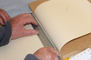 Couper 4 feuilles de garde et 2 feuilles de macule à la dimension exactes des plats de couverture
